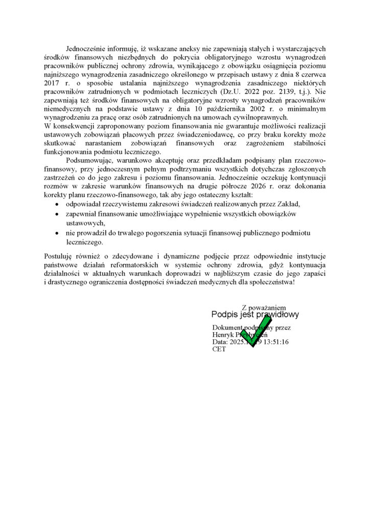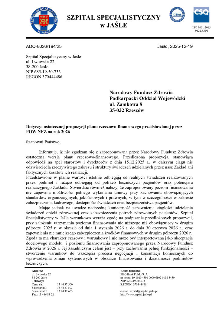 Szpital Specjalistyczny w JaśleAktualności Pismo Dyrektora Szpitala Specjalistycznego w Jaśle w sprawie ostatecznej propozycji planu-rzeczowo – finansowego przedstawionego przez POW NFZ na rok 2026
