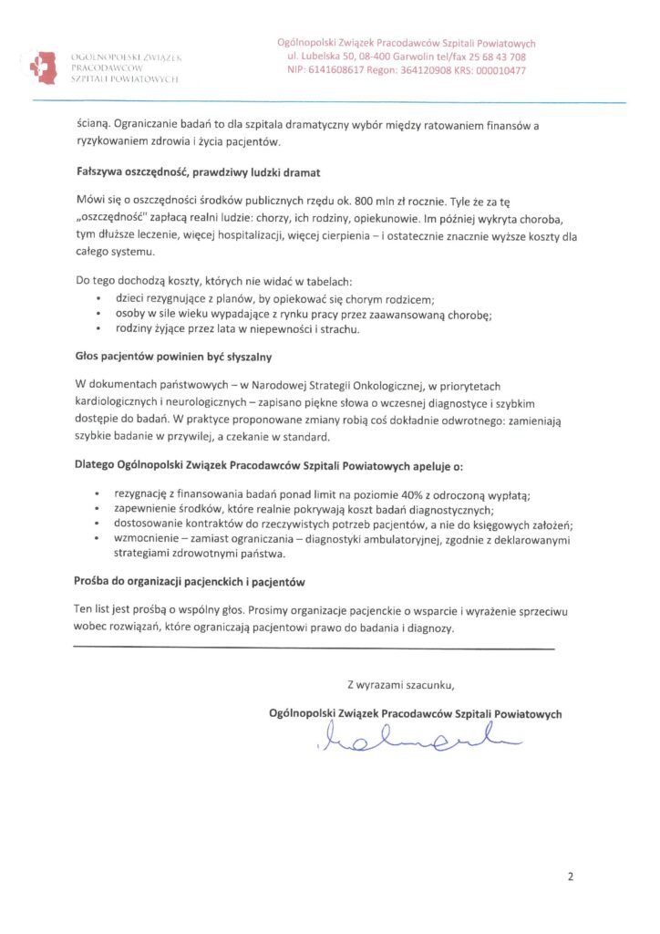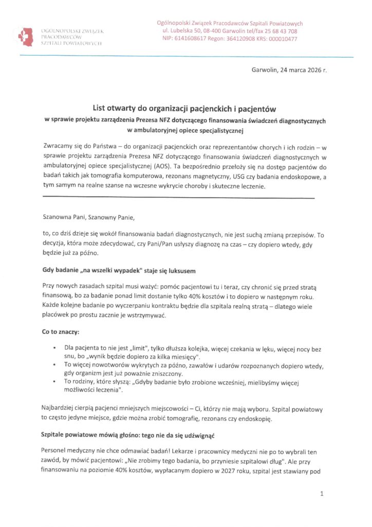 List otwarty Ogólnopolskiego Związku Pracodawców Szpitali Powiatowych w sprawie projektu zarządzenia Prezesa NFZ dotyczącego finansowania świadczeń diagnostycznych w ambulatoryjnej opiece specjalistycznej